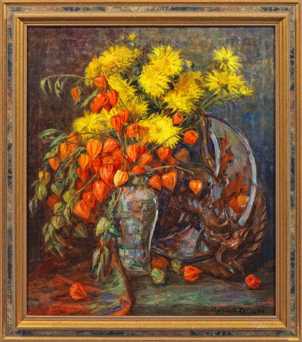 Im pastosen, expressiven Duktus das Stillleben mit spätsommerlichen Blumen. Ein in Stil und Motiv typisches Werk der belgischen Künstlerin, die Ihre Ausbildung bei Ernest Blanc-Garin und François Jean Portaels erhielt. Öl/Lwd.; R. u. sign., verso a. Ausstellungsetikett bez.; Stellenweise ger. Retuschen. 80,5 cm x 70 cm. Rahmen.