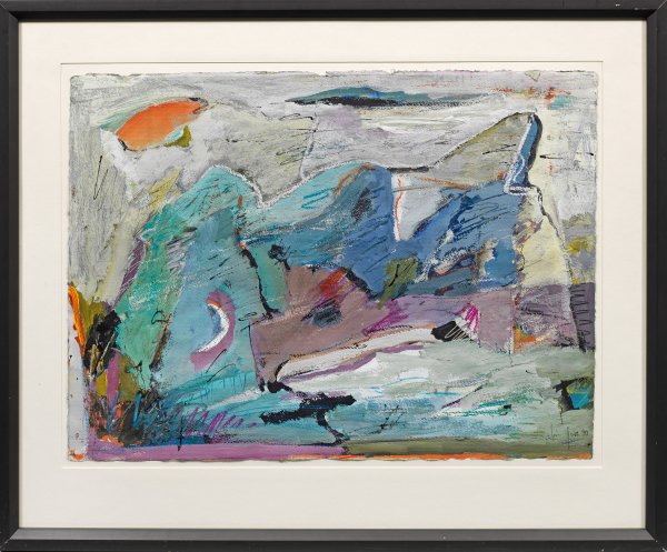 Mit expressivem Duktus gemalte Landschaftsassoziation der Künstlerin, die ab 1948 in Ost-Berlin aufwuchs und ihre künstlerische Ausbildung 1975-1978 in der Werkstatt von Eberhard Hückstädt in Schwedt erhielt. Seitdem wirkt sie als freischaffende Malerin, zunächst in der DDR, seit 1984 in Hannover. In ihren Arbeiten mit poetisch-lyrischem, zuweilen melancholischem Ausdruck schildert sie sowohl stilisierte Figuren, Tänzer, Gruppen als auch Landschaften. Mischtechnik/Papier. R. u. sign. u. dat. (19)90. 48 cm x 65,5 cm.