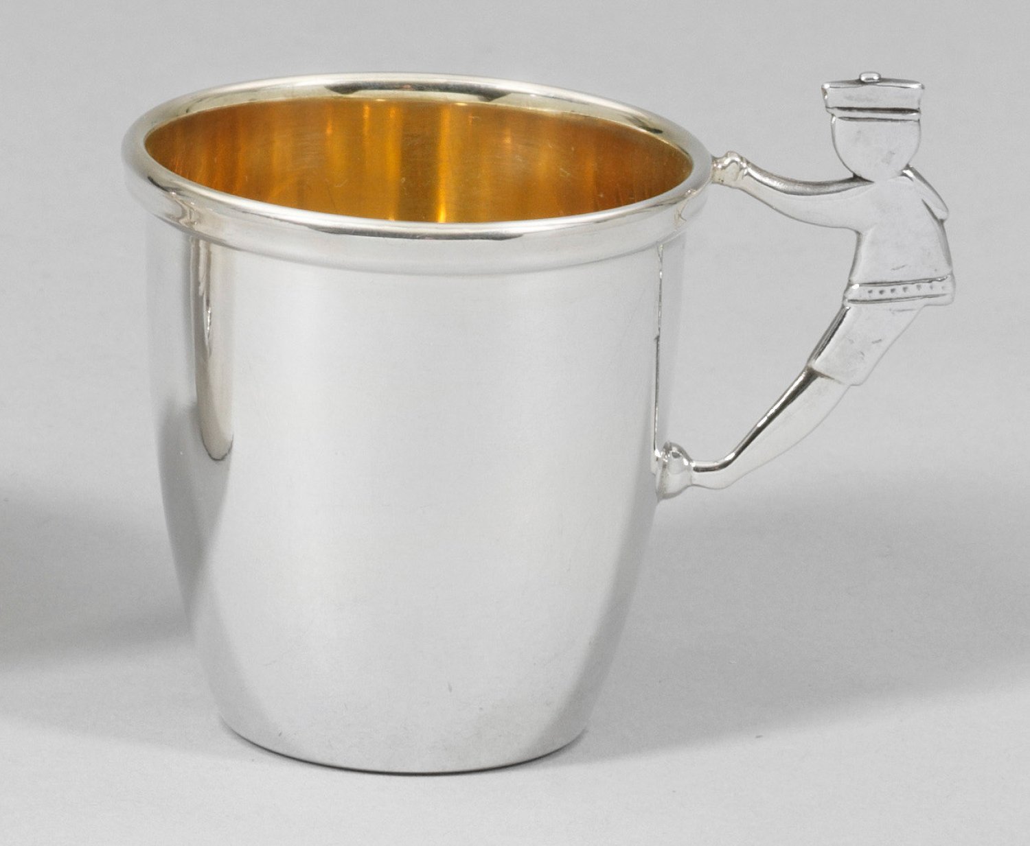 Silber. Konisch, mit glatter Wandung und profiliertem Lippenrand. Plastischer Henkel in Gestalt eines Jungen. Innen vergoldet. Gest. 925. Gew. ca. 61 g. H. 6,5 cm.