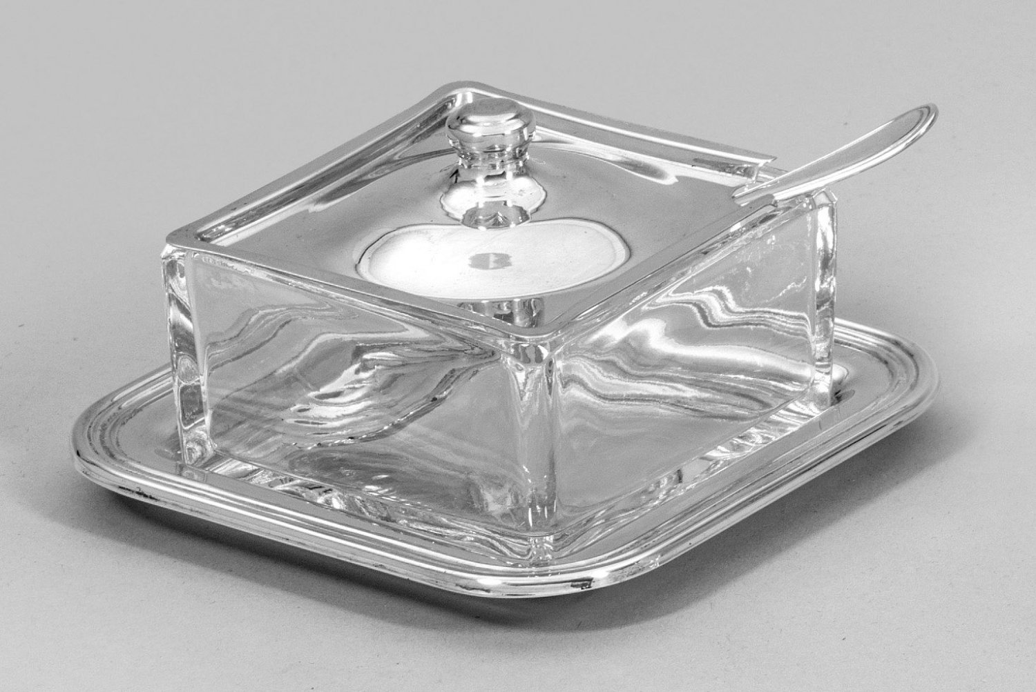 Silber und Glas. Quadratischer, gemuldeter Untersetzer mit mehrfach profiliertem Rand und gerundeten Ecken. Darüber eine flache, quadratische Schale mit gering gewölbtem Deckel und gedrücktem Balusterknauf. Im Deckel Aussparung für ergänzten Löffel mit muschelförmiger Laffe. Gest. 800 bzw. 925. Beschauzeichen, Stadtmarke. H. 6,5 cm. 12 cm x 12 cm.