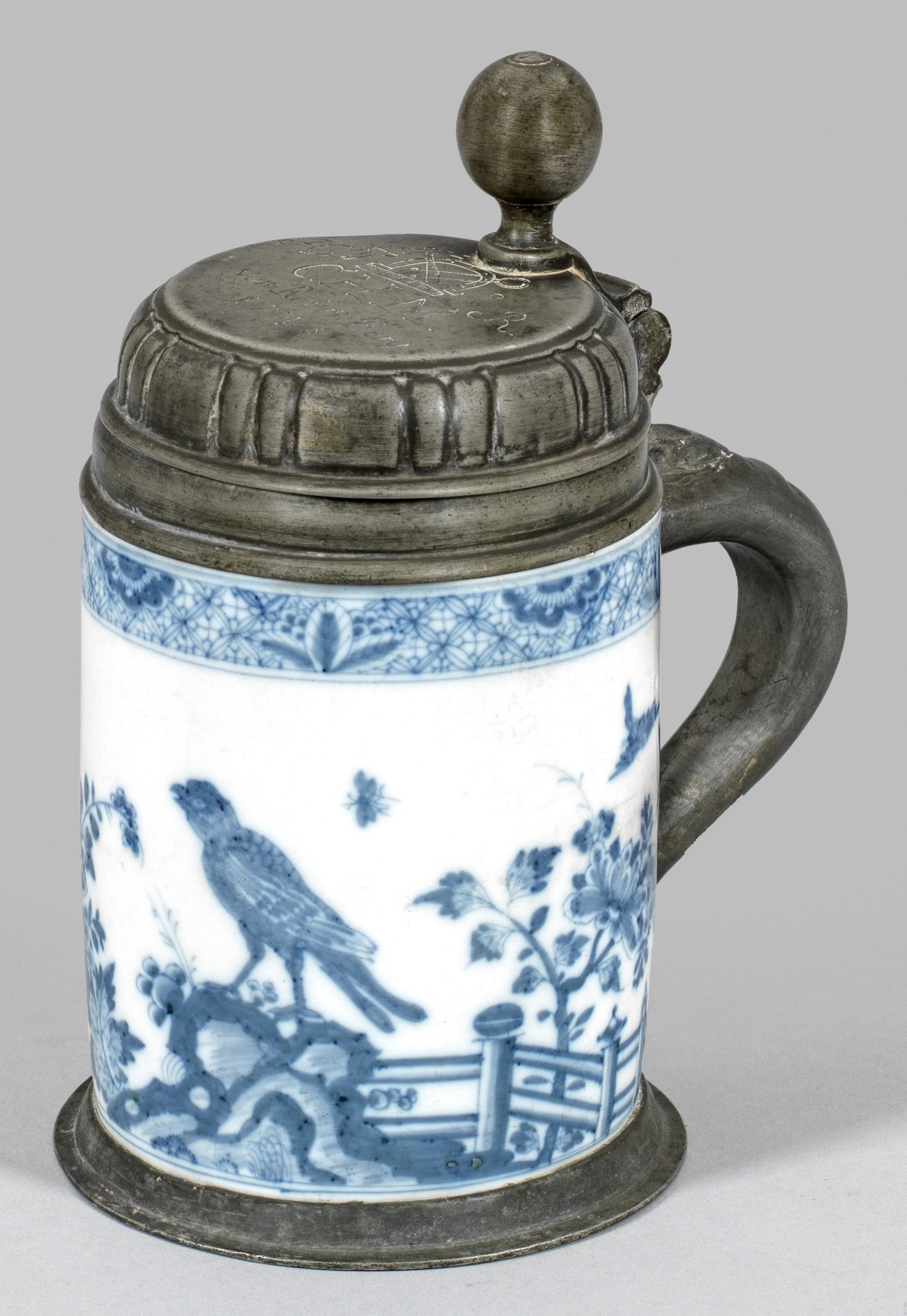 Zylindrischer, leicht bombierter Korpus. Auf der Wandung umlaufender Dekor nach ostasiatischem Vorbild. Auf einem Felsen sitzender Vogel umgeben von blühenden Chrysanthemen- und Prunuszweigen. Breite Brokatbordüre. Unterglasurblaue Malerei. Zinnmontierung. Deckel mit kugelförmiger Daumenrast, undeutl. gem.; Zunftsymbolik mit Bez. "JGR/CHM/ von Reins Berg (von Reinsberg) und Dat. 1746. Alters- und Gebrauchsspuren. Schwertermarke. H. 22 cm (mit Montierung).