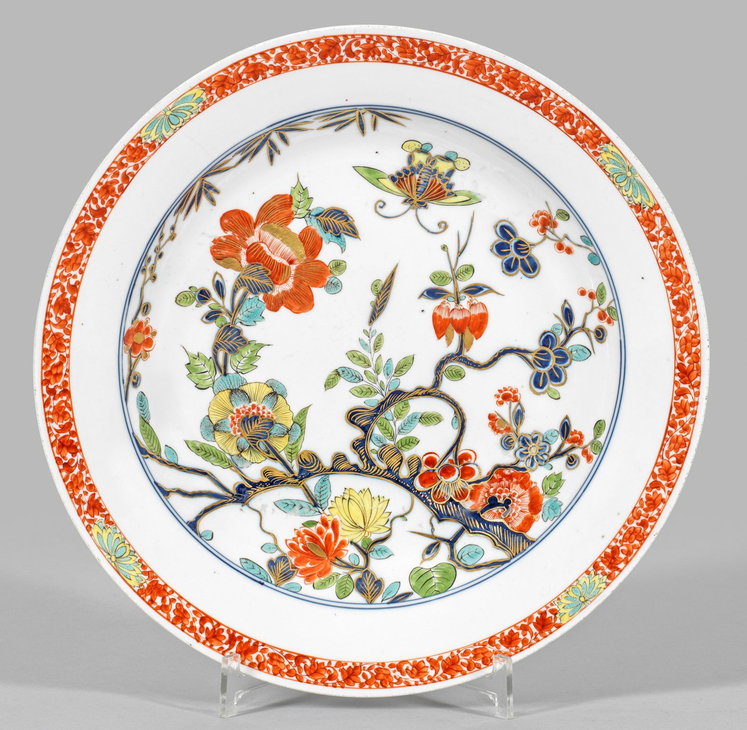 Runde, gemuldete Form. Im Spiegel weit verzweigter Ast mit Blüten und Blättern in goldgehöhter, unterglasurblauer Malerei. Teilw. überdekoriert mit blühenden Päonien- und Prunusblüten. Umlaufende Rankenwerkbordüre mit stilisierten, gelb-seegrünen Chrysanthemen. Polychrome Malerei in Eisenrot, Seegrün, Moosgrün und Gelb. Blaumaler-Sign. "K" wohl Johann David Kretzschmar oder Peter Kolmberger. Am Standring innen Ritznr. 3 für Schalengröße. Schwertermarke. D. 34 cm.