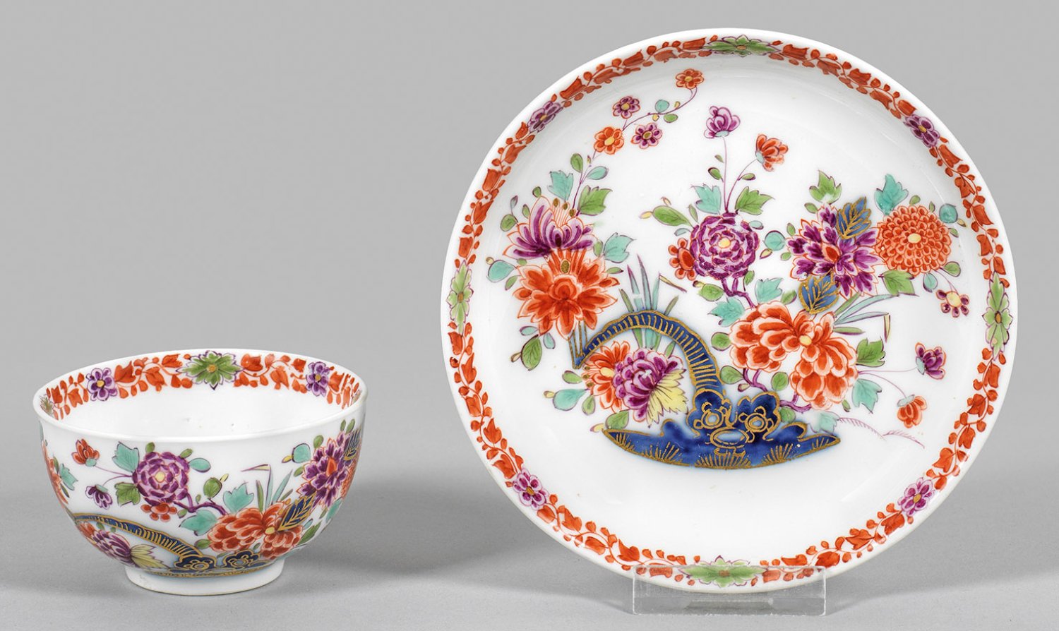 auf Unterschale. Halbkugeliger Korpus mit leicht ausschwingendem Rand. Auf der Wandung und im vertieften Spiegel feiner Fels- und Blumendekor nach ostasiatischem Vorbild. Hinter einem Fels emporwachsende, blühende Päonien- und Chrysanthemenzweige. Unterglasurblaue, in Gold gehöhte Malerei, überdekoriert in leuchtendem Eisenrot, Purpur, Moos- und Seegrün sowie Gelb. Umlaufende Innenwandbordüre aus Blattranken im Wechsel mit einzelnen Blüten. Im Spiegel des Koppchens einzelne Päonie in voller Blüte. Dreher- und Formerzeichen für Gottfried Seydel (tätig ab 1732). Schwertermarke. H. 4 cm.