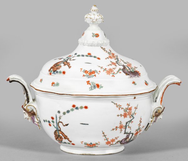 Ovaler, gebauchter Korpus, seitlich Handhaben in Gestalt eines reliefplastischen Maskarons mit emporragender Federbekrönung. Aufgewölbter, mittig hoher, mehrfach gegliederter Knauf mit Kronenabschluss. Auf der Wandung feiner Kakiemondekor nach japanischem Vorbild mit gelbem Löwen (bzw. gestreiftem Tiger), sich um einen blauen Bambusstab windend. Unweit stehender Chrysanthemenbaum sowie Indianische Blütenzweige. Polychrome, teilw. goldgehöhte Malerei. Kapuzinerbraune Randlinie. Schwertermarke. H. 27,5 cm.