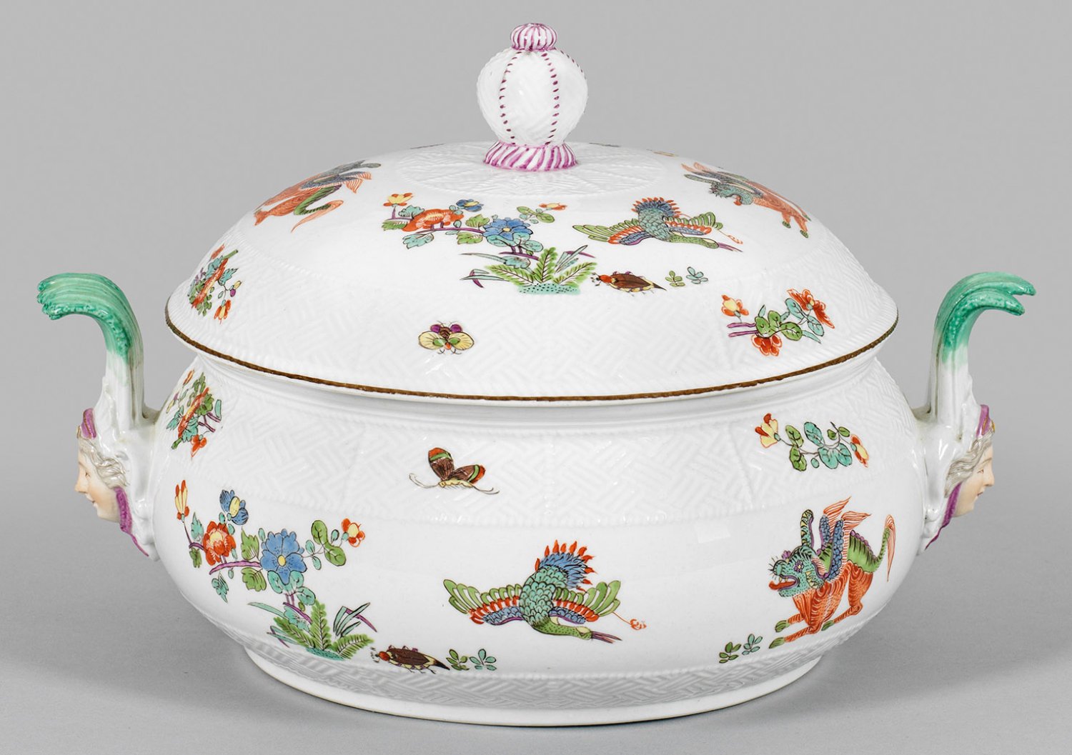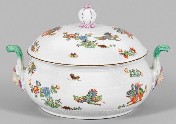 Auf kurzem Standring runder, gebauchter Korpus mit eingezogenem Rand. Seitlich, von reliefplastischem Frauenkopf aufsteigende Blattbüschel als Handhaben. Aufgewölbter Deckel mit Kugelknauf. Reliefdekor "Sulkowski". Auf der Wandung und dem Deckel sog. Koreanischer Löwe unweit eines fliegenden Reihers, umgeben von Arrangements aus Päonienzweigen, Gräsern und Farnen sowie Maikäfern und Schmetterlingen. Polychrome Malerei im Kakiemonstil in Eisenrot, Emailblau, See-und Moosgrün, Purpur und wenig Gelb. Schwertermarke. H. 19 cm. D. 23 cm.