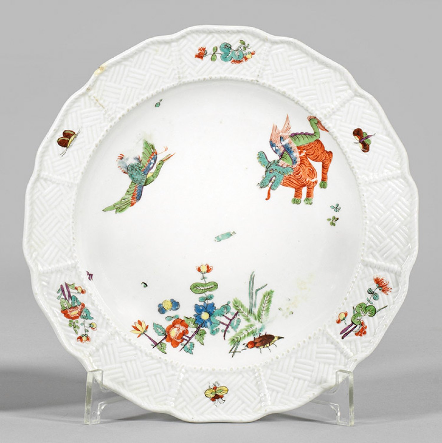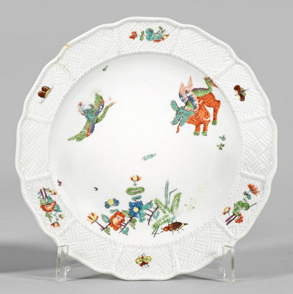 Runde Form mit fassoniertem Rand. Reliefdekor "Sulkowski". Im leicht vertieften Spiegel sog. "Koreanischer Löwe" unweit eines fliegenden Reihers, umgeben von Päonienzweigen, Gräsern und Farnen sowie Maikäfer, auf der Fahne Blütenzweige und Schmetterlinge. Polychrome Malerei im Kakiemonstil in Eisenrot, Emailblau, See- und Moosgrün, Braun, Gelb und Purpur. Ber.; Teilw. minim. best.; Schwertermarke. D. 23 cm.