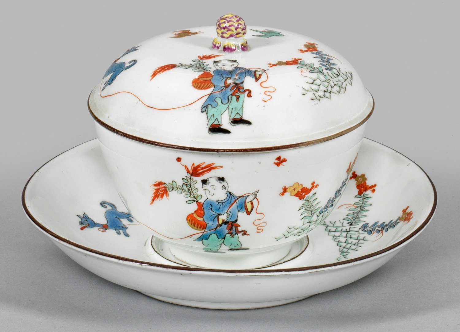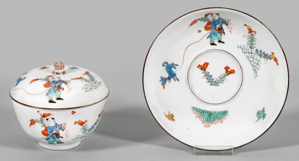 auf Unterschale. Halbkugeliger Korpus mit gehöhtem Deckel, mittig plastischer Kugelknauf. Auf der Wandung, dem Deckel und im Spiegel Darstellung eines Knaben, umgeben von asiatischen Blütenzweigen und Vögeln, auf dem Rücken eine Vase mit Zweigen tragend sowie einen Löwen an einem Strick führend. Nach Vorbildern japanischer Kakiemondekore. Polychrome Malerei in Emailblau, Seegrün, Eisenrot und wenig Schwarz sowie Goldhöhungen. Dunkelbraune Randlinie. Press-Nr. 5. Schwertermarke. H. 10 cm. Schalen-D. 10 cm.