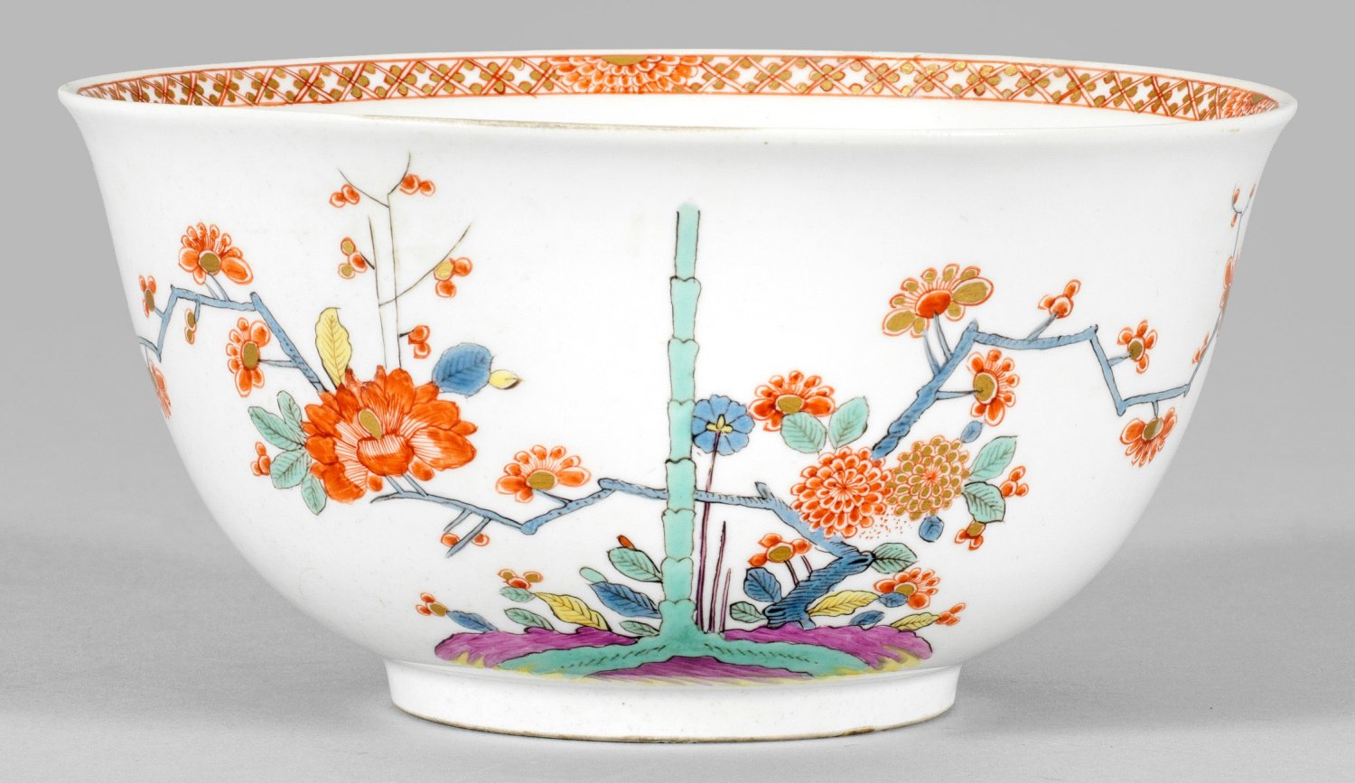 Auf kurzem Standring runder, leicht gebauchter, sich konisch erweiternder Korpus mit leicht ausschwingendem Rand. Auf der Wandung feiner Kakiemondekor. Über stilisiertem Terrain ein emporragendes Bambusrohr zwischen kräftigem, sich verzweigendem Päonienbaum sowie einer Chrysanthemenstaude. Im Spiegel kleiner Blütenzweig. Umlaufende Brokatbordüre aus Halbblüten und Gitterwerk. Polychrome, goldgehöhte Malerei in Eisenrot, Emailblau, Seegrün, Purpur und Gelb. Schwertermarke. H. 8 cm.