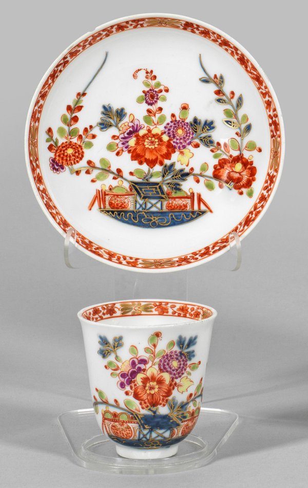 auf Unterschale. Sog. "Tischchenmuster"-Dekor in unterglasurblauer Malerei, überdekoriert in leuchtendem Eisenrot, Purpur, Moosgrün und Gelb. Umlaufende Rankenbordüre mit Goldblüten. Teilw. Dreher- und Formerzeichen. Schwertermarke. H. 6,5 cm.