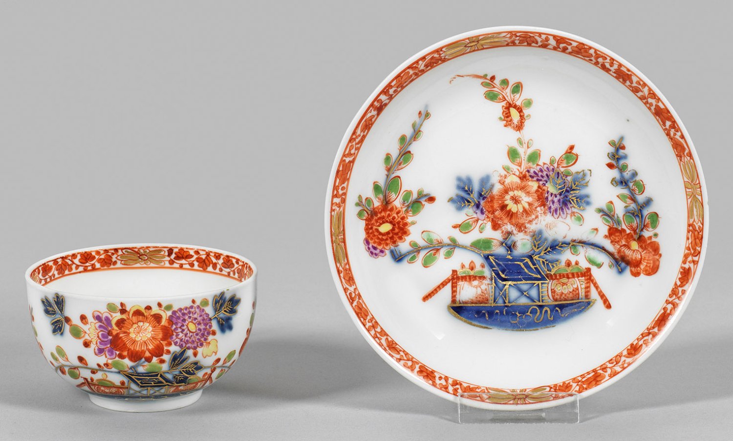 auf Unterschale. Halbkugeliger Korpus mit gebogtem Henkel. Auf der Wandung und im vertieften Spiegel sog. "Tischchenmuster" mit blühenden Chrysanthemen und Päonien in unterglasurblauer Malerei, überdekoriert in leuchtendem Eisenrot, Purpur, Moosgrün und Gelb. Umlaufende Innenwandbordüre aus Blattranken und Goldblüten. Teilw. Former- und Dreherzeichen 4 für Johann Georg Schuberth (tätig ab 1731). Teilw. Blaumalerzeichen J (?). Schwertermarke. H. 4,5 cm.