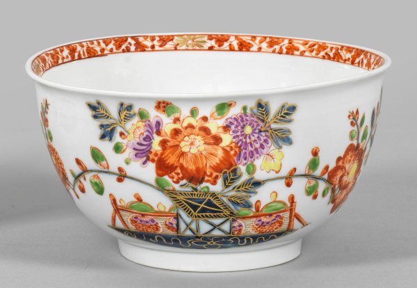Runder, leicht gebauchter Korpus mit leicht ausschwingendem Rand. Beidseitig der Wandung sog. Tischchenmuster mit farbenprächtigen Chrysanthemen- und Päonienzweigen. Unterglasurblaue Malerei, polychrom überdekoriert in Eisenrot, Purpur, Grün und Gelb. Innenrand mit umlaufender Rankenbordüre mit Goldblüten. Blaumalerzeichen B. Schwertermarke. H. 8,5 cm.