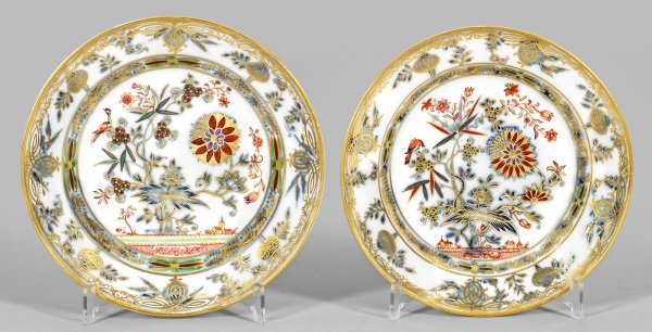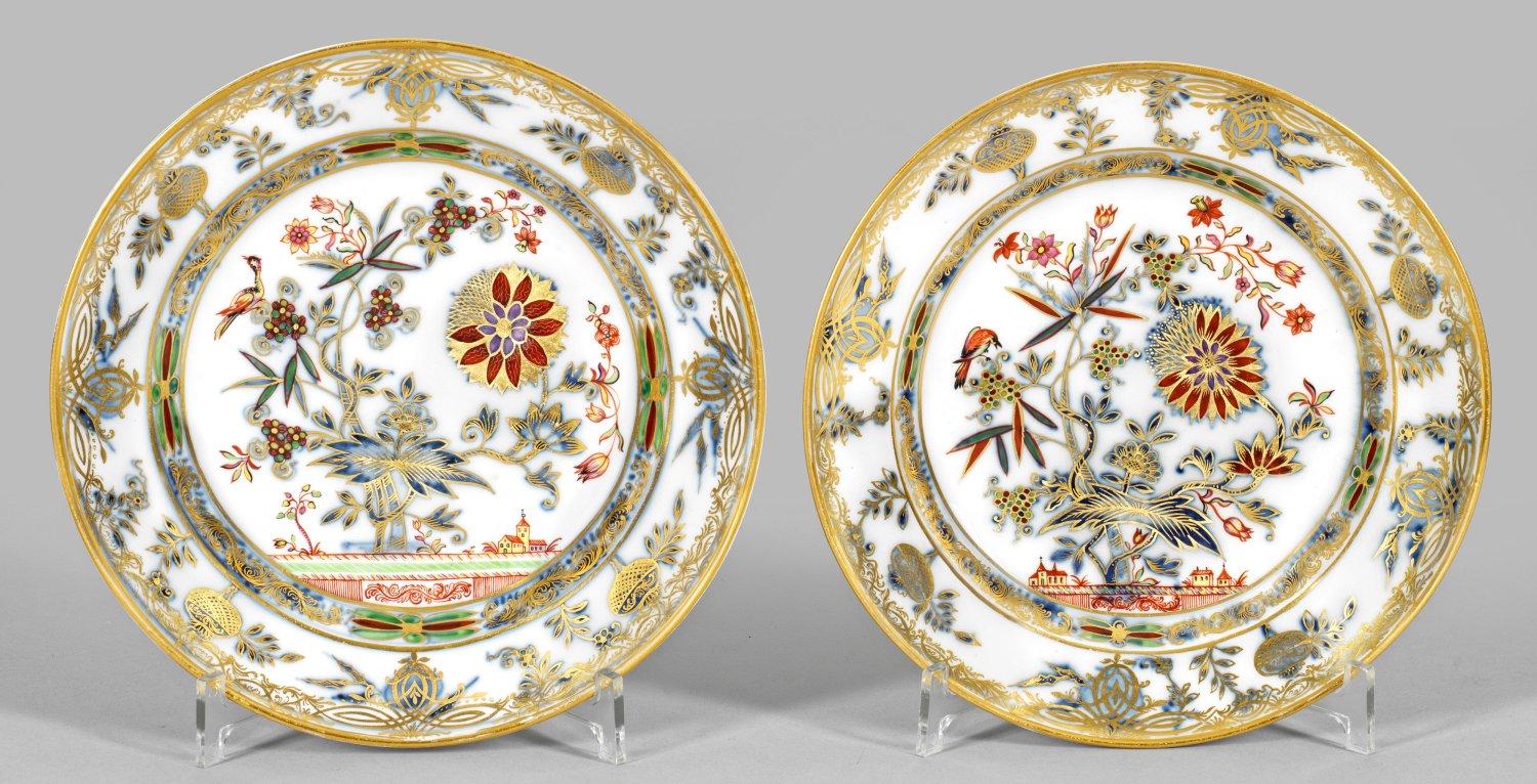 Runde, leicht vertiefte Form mit glattem Rand. Im Spiegel und auf der ansteigenden Fahne Zwiebelmusterdekor, überdekoriert mit Blumen und Vogelmotiven sowie Ornamentik, wohl von der Hausmaler-Werkstatt von F. J. Ferner. Unterglasurblaue, polychrome und Goldmalerei. Ein Teller am Stand best.; Schwertermarke. D. 23,5 cm - 24 cm.