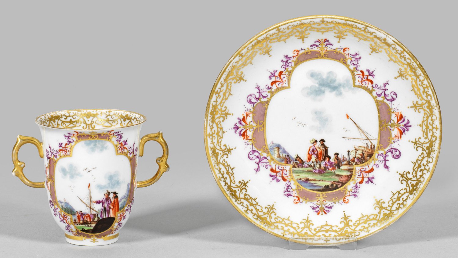 auf Unterschale. Becherförmiger, konisch ansteigender Korpus mit vergoldetem Doppelhenkel aus gegenläufigen Voluten. Beidseitig der Wandung und im gemuldeten Spiegel vierpassige, von eisenrotem und purpurfarbenem Laubwerk gerahmte Goldornamentreserven mit Lüsterfond. Darin unterschiedliche, sog. Kauffahrteiszenen. Figurenreiche Darstellungen vor Hafenkulisse von Kaufleuten beim Verhandeln über angelandete Schiffladungen sowie Arbeiter zwischen Ballen und Fässern. Polychrome Malerei. Breite Goldspitzenbordüren. Unterschale mit drei Ringlinien in Eisenrot. Gold-Nr. "31". H. 7,5 cm.