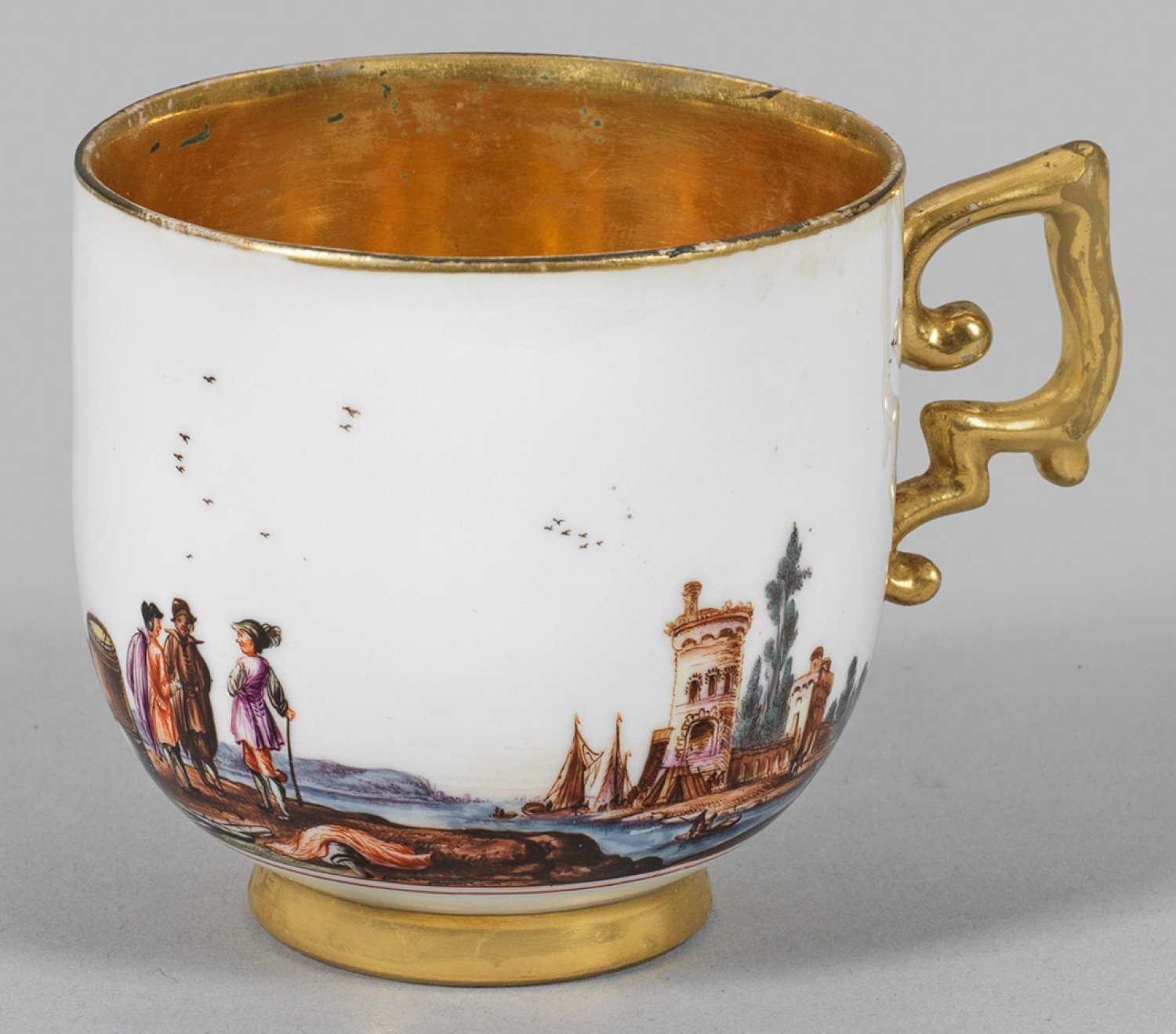 Becherförmiger Korpus, seitlich vergoldeter, volutierter J-Henkel. Umlaufend auf der Wandung sog. Kauffahrteiszene. In weiter Landschaft mit imposanter Architekturkulisse, am Ufer liegende Segelboote und zwischen Fässern und Ballen stehende Kaufleute beim Verhandeln von Ware in feiner polychromer Malerei. Innenwandvergoldung. Dreher- und Formerzeichen für Johann Gottlieb Geithner Junior. Goldbuchstabe H. Reste von Eisengallustinte. Schwertermarke. H. 7 cm.