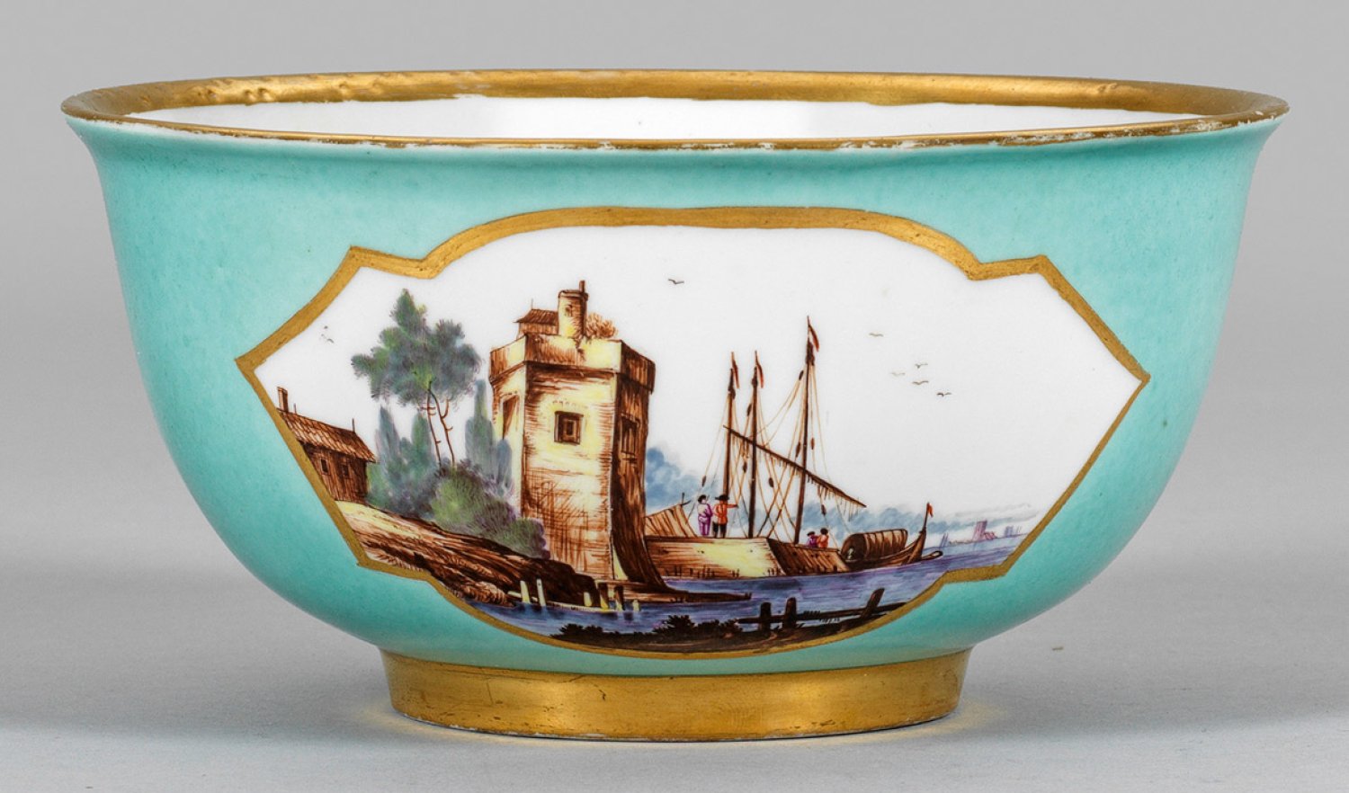 Auf kurzem Standring runder, leicht gebauchter, sich konisch erweiternder Korpus mit leicht ausschwingendem Rand. Beidseitig der Wandung in zartem Türkisfond ausgesparte, goldkonturierte Vierpassreserve. Darin Kauffahrteiszene mit an Flußufern angelegten Segelschiffen vor teilw. bergiger Landschaftskulisse mit großen Architekturen sowie Figurenstaffage. Im Spiegel der Kumme in eisenroter Doppelringlinie gerahmtes Medaillon mit korrespondierender Darstellung. Unw. rest.; Schwertermarke. H. 8 cm. 16,5 cm.