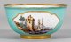 A turquoise ground porcelain rinsing bowl polychrome painted with Kauffahrtei scenes framed in gold-contoured quatrefoil cartouches. Insignificantly restored. Crossed swords mark.