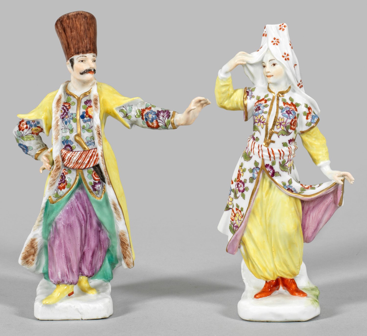 aus der Serie "Volksgruppen". Auf rechteckigem Sockel stehender Türke in gelbem, pelzgefüttertem Mantel über purpurfarbener Pluderhose und mit Indianischen Blumen gemusterter Weste. Das dunkle Haar mit brauner, hoher Kopfbedeckung. Das Gegenstück eine Türkin in anmutig tänzerischer Pose, gekleidet in einen gegürteten, weißen, blumig gemusterten Mantel über gelber Pluderhose sowie mit roten Schuhen. Auf dem Kopf eine Haube mit einem langen, zartgelben Schleier tragend. Polychrome Malerei mit Goldstaffage. Entw. Peter Reinicke/ J. J. Kaendler/Eberlein. Minim. rest.; H. 16,5 cm - 17 cm.