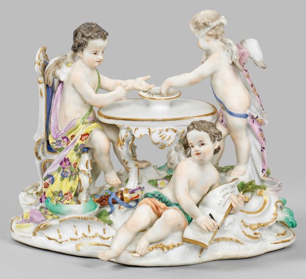 Unregelmäßiger, von reliefplastischen Rocaillen umzogener Sockel mit plastisch aufgelegten Blüten und Blättern. An einem Rokokotisch sitzender Amor, auf eine mit Losen gefüllte Schale weisend, aus der ein weiterer geflügelter Knabe mit verbundenen Augen ein Los entnimmt. Am Boden, unweit eines mit Pfeilen gefüllten Köchers, sitzender Amor, in das aufgeschlagene Buch des Lebens schreibend. Die Gewänder sind farbenfroh staffiert in Antimongelb, Smaragdgrün und Purpur mit feinem Dessin aus Indianischen Blumen und Goldblüten. Polychrome Malerei mit reicher Goldstaffage. Entw. Johann Joachim Kaendler. Schwertermarke. H. 18 cm.