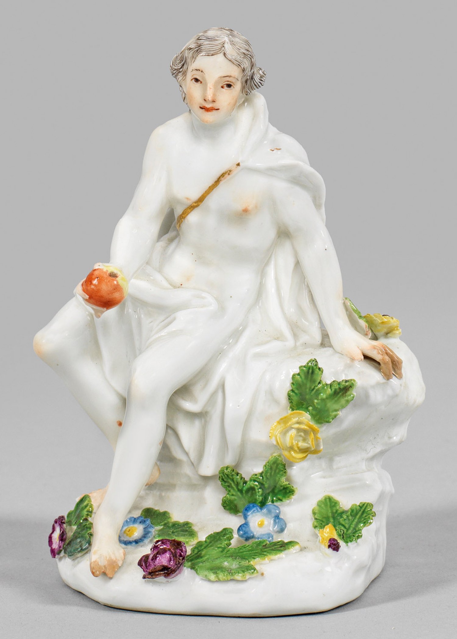 Auf einem mit plastischen Blumen und Blättern belegten Felssockel sitzender, in einen langen Umhang gekleideter, Paris. In seiner rechten Hand einen Apfel haltend. Sparsame, polychrome Malerei mit Goldkonturierung. Minim. best./rest.; H. 12 cm.