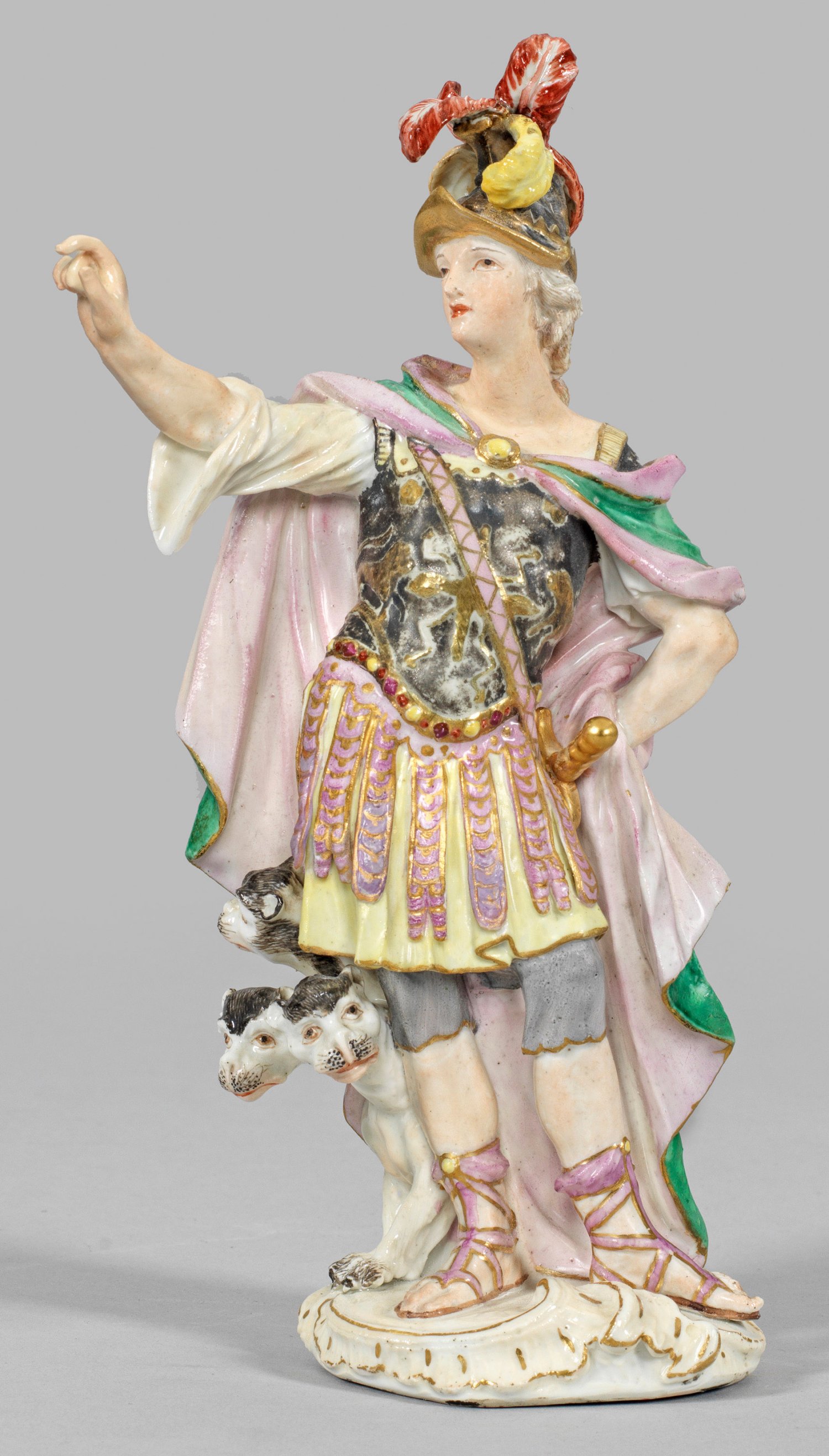 Auf rocaillereliefiertem Sockel, in majestätischer Haltung stehender, junger Feldherr Alexander der Große in römischer Gewandung mit Harnisch und weitem, herabfallendem Mantel, seitlich der gegürtete Gladius. Das Haupt bedeckt von einem dunklen Helm mit umlaufender Zackenkrone sowie Federbusch. Die rechte Hand hat er erhoben, mit der Linken rafft er den Mantel. Begleitend ein "vierköpfiger Panther" (bzw. dreiköpfiger Zerberus). Entw. Johann Joachim Kaendler, um 1753/1767. Rest.; Schwertermarke. H. 22 cm.