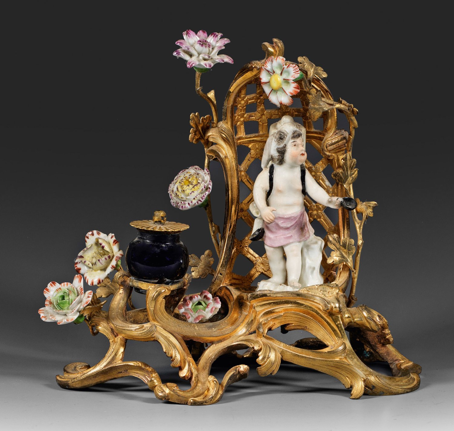 Feuervergoldete, fein ziselierte französische Bronzemontierung. Über rocailleförmig gerahmtem Sockel gitterförmig durchbrochen gearbeitete, nischenartige Spalierlaube, umzogen von aufsteigenden, sich verzweigenden Blattranken mit farbig staffierten sog. Vincennes-Porzellanblüten. Darin Meissener Figur eines Puttos als Limonadenverkäufer aus der Serie „Verkleidete Amoretten“, gekleidet in purpurfarbenem Lendentuch und pelzgefütterter Mütze. Auf dem Rücken einen Vorratskanister mit Limonade tragend. Unweit ein bauchiges Gefäß aus tiefblauem Glas mit vergoldetem Deckel. Polychrome Malerei. Figuren-Entw. Johann Joachim Kaendler. Minim. best./rep.; Meissen. Mitte 18. Jh.; Ges.-H. 18,5 cm.
