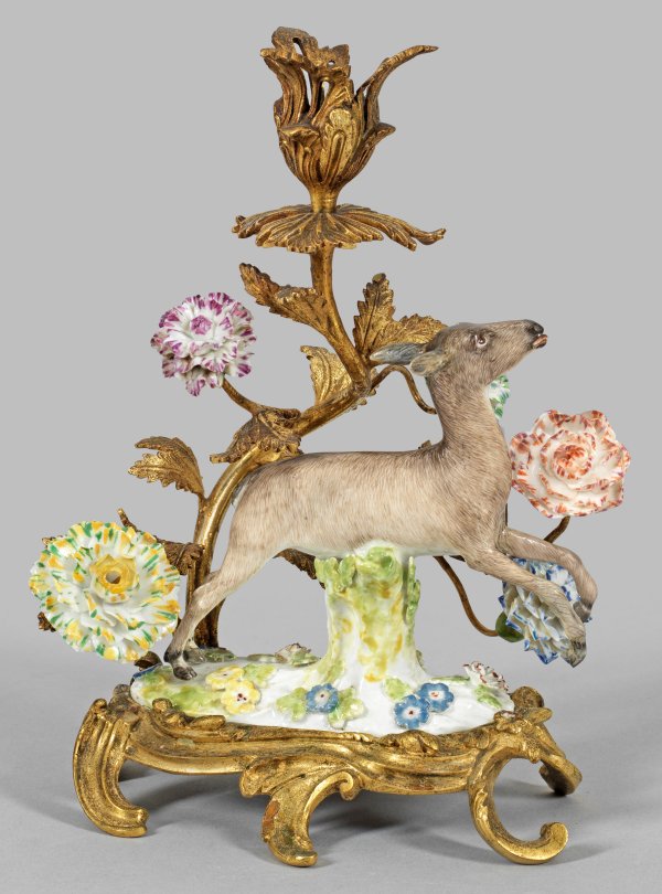 Rocailleförmiger Sockel. Rückseitig aufsteigende, sich verzweigende Blumenranken mit verschiedenfarbig staffierten, sog. Vincennes-Blüten, in blattförmiger Tülle mit Wachsfänger endend. Schauseitig die Porzellanfigur eines springenden Rottiers in naturalistischer Ausführung mit feiner Fellzeichnung über ovalem, blütenbelegtem Sockel. Entw. Johann Joachim Kaendler. Polychrome Malerei. Unw. rest.; Schwertermarke. Leuchter-H. 20 cm.