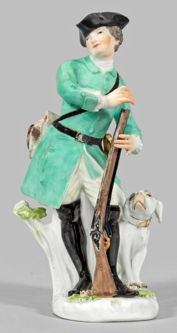 Auf einem mit plastischen Blüten und Blättern belegten Sockel stehender Jäger in seegrünem Rock, weißer Hose und schwarzen Stulpenstiefeln. Das Haar von einem Dreizack bedeckt. Ein am Boden aufrecht gestelltes Jagdgewehr haltend, auf dem Rücken eine Felltasche mit Rebhuhn tragend. Zu seinen Füßen sitzender Vorstehhund. Polychrome Malerei mit wenig Gold. Entw. Johann Friedrich Eberlein. Unw. rest./best.; Schwertermarke. H. 17,5 cm.