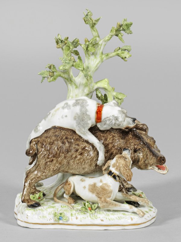 Auf unregelmäßigem, von plastischen Blüten und Blättern belegtem Sockel mit Eichenbaum vollplastische, szenische Darstellung eines Ebers, gestellt und angefallen von zwei Jagdhunden. Polychrome Malerei mit wenig Gold. Entw. Johann Joachim Kaendler, 1746. Unw. best./rest.; Schwertermarke. H. 24,5 cm.