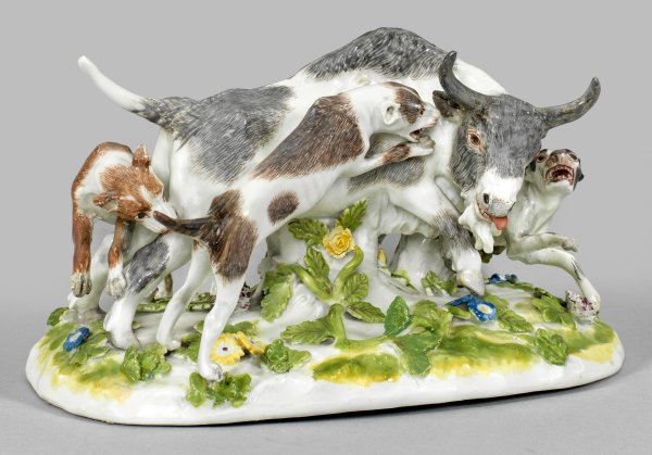 Auf ovalem, mit plastischen Blüten und Blättern belegtem Sockel stehender, in dynamischer Bewegung wiedergegebener Auerochse im Kampf mit drei angreifenden Jagdhunden in naturalistischer Modellierung mit feiner Fellzeichnung. Entw. Johann Joachim Kaendler. Im Boden Reste einer alten Inv.-Nr.; Unw. rest.; Schwertermarke. H. 15 cm.