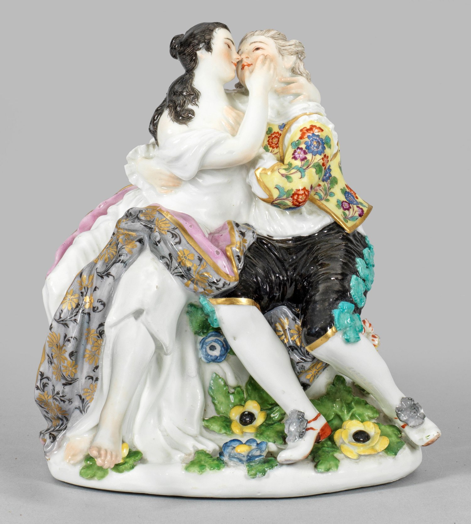 Unregelmäßiger, mit großen plastischen Blüten und Blättern belegter Sockel. Erhöht sitzendes, sich innig umarmendes, karessierendes Liebespaar. Junger Kavalier in gelber, mit Indianischen Blumen gemusterter Jacke über weißem Hemd mit Rüschenkragen sowie rosettenverzierter, schwarzer Kniebundhose, mit der rechten Hand die Taille seiner Geliebten umfassend. Die Dame in faltenreichem, weißem Gewand mit grauem, von Goldblumen gehöhtem und purpurfarben gefüttertem Überwurf, die Wange des jungen Herrn streichelnd. Polychrome Malerei mit Goldstaffage. Entw. Johann Joachim Kaendler und Johann Friedrich Eberlein. Unw. rest.; Meissen. Um 1740. H. 15 cm.