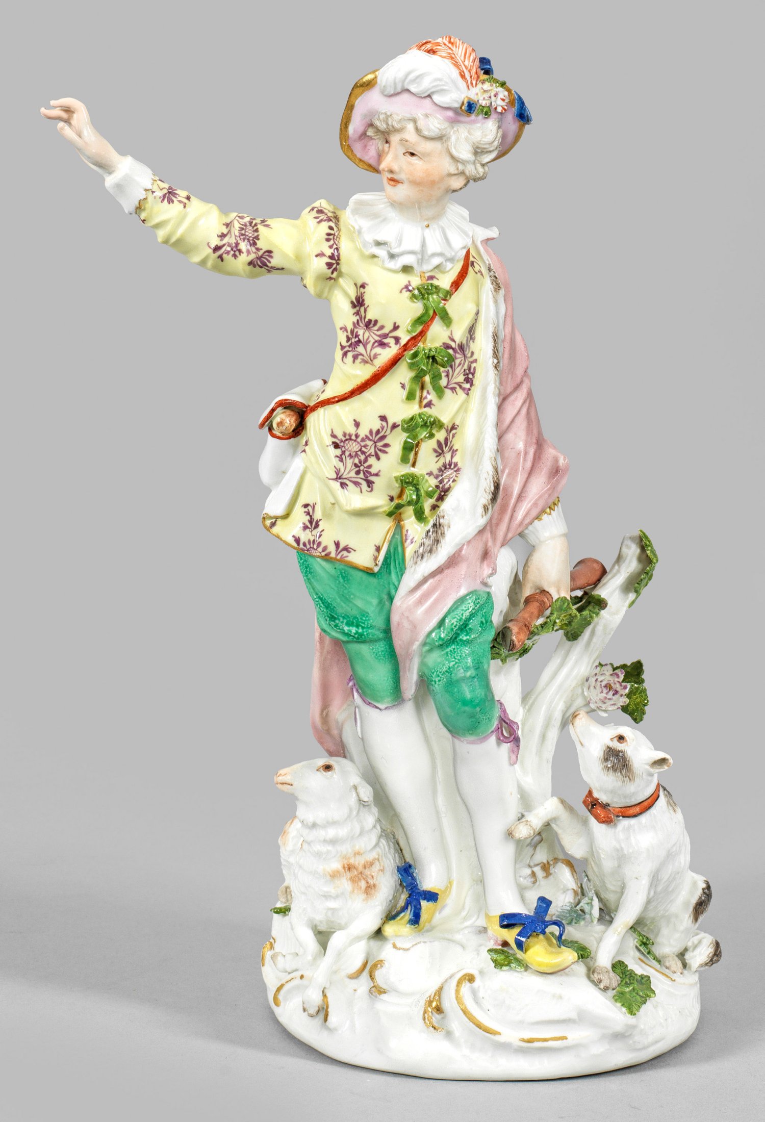 Auf rocaillereliefiertem, mit plastischen Blättern belegtem Sockel stehender junger Kavalier in seegrüner Kniebundhose, zartgelber, purpurfarben geblümter Jacke mit weißem Kragen, pelzgefüttertem, roséfarbenem Mantel sowie mit Federhut. Den rechten Arm zum Gruß erhoben. In der linken Hand eine Flöte haltend. Zu seinen Füßen sitzender Hund und liegendes Schaf. Polychrome Malerei mit Goldstaffage. Entw. wohl Friedrich Elias Meyer. Unw. rest.; Schwertermarke. H. 25 cm.