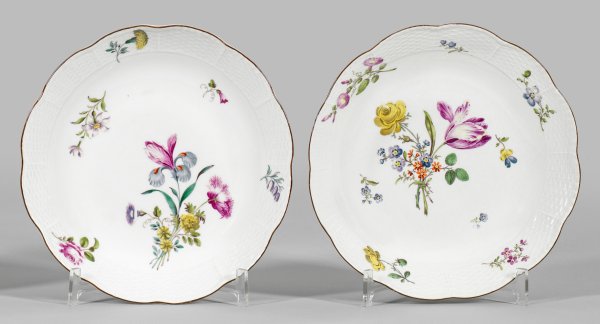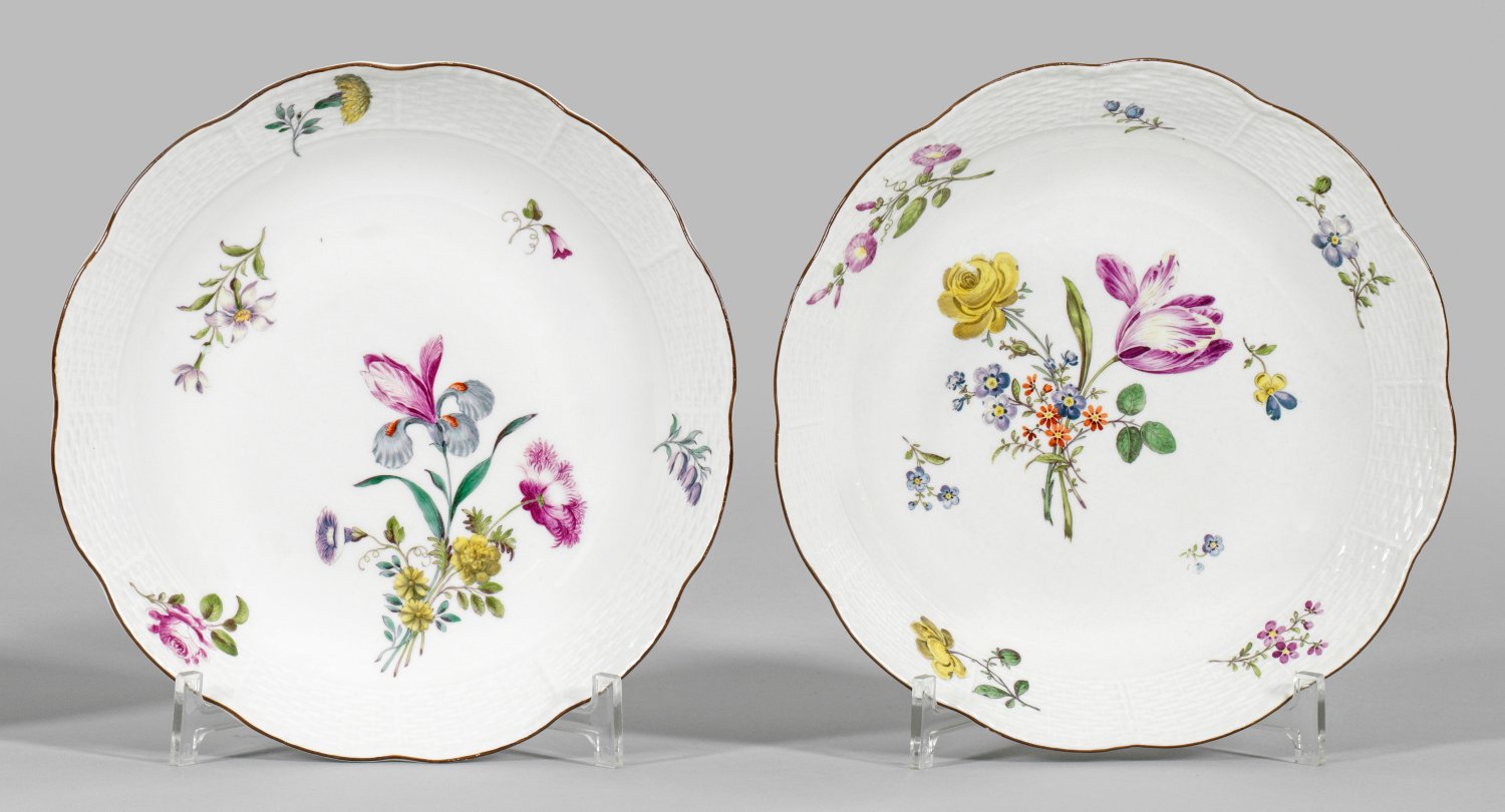 Runde, gemuldete Form mit passig geschweiftem, kapuzinerbraunem Rand. "Altozier"-Reliefdekor. Im Spiegel und auf der ansteigenden Wandung feine Arrangements aus Manierblumen, umgeben von vereinzelten, gestreuten Blumen in äußerst feiner polychromer Malerei. Schwertermarke. D. 24 cm.