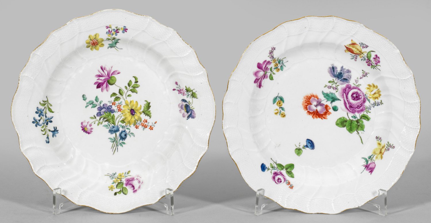 A pair of porcelain plates with flower decor. Partly minor chipped. Crossed swords mark.