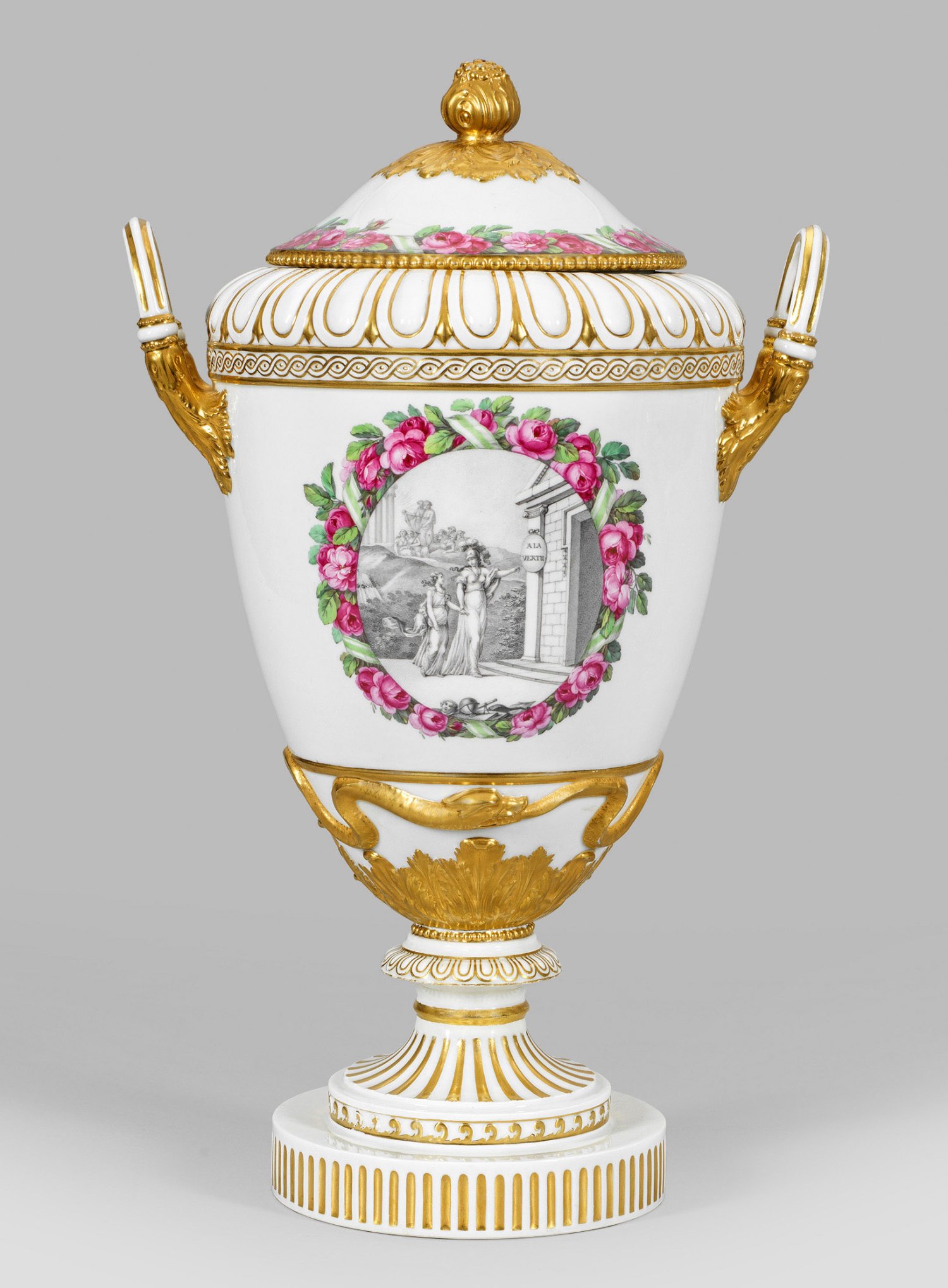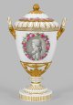 Über mehrfach gegliedertem Rundfuß ovoider Korpus mit gebogten Handhaben. Reicher goldstaffierter Reliefdekor. Der gewölbte Deckel mit plastischem Knospenknauf und Blattrosette. Schauseitig eine ovale, von einem farbenprächtigen Rosenfeston gerahmte Reserve mit dem "en grisaille" -Bildnis der Friederike Luise von Preußen als Kronprinzessin, geborene Prinzessin von Hessen-Darmstadt und spätere Königin von Preußen, dargestellt im Profil nach links gewandt. Nach Vorlage einer anonymen, vom Oktober 1782 datierten Bleistiftzeichnung, heute im Archiv der KPM Berlin. Rückseitig die Darstellung einer Frau, die von Minverva, Göttin der Weisheit, in den Tempel der Tugend ("à la Vertu") geführt wird. Polychrome sowie feine Grisaillemalerei mit aufwendig gestalteten Goldradierungen. Unw. rest.; Zeptermarke. H. 49 cm.