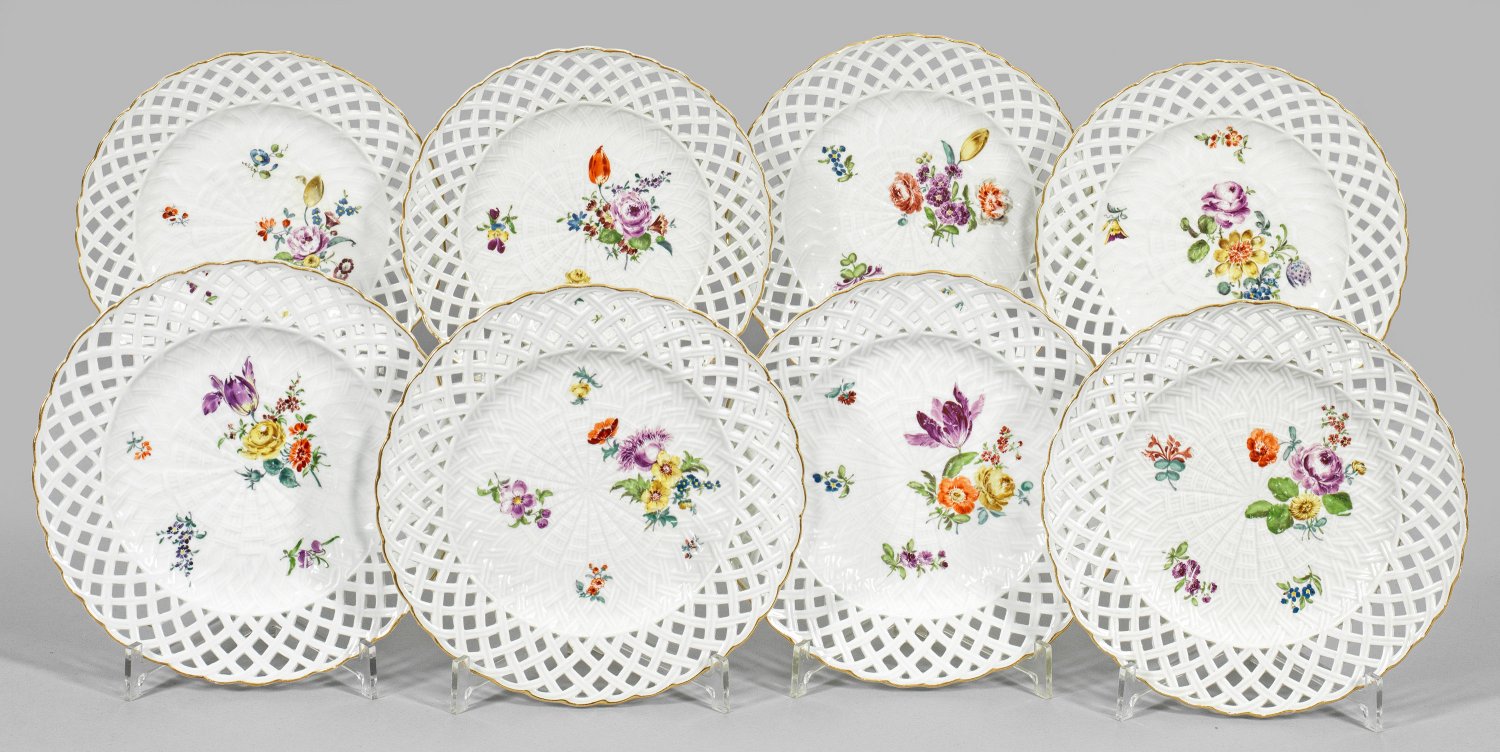 A collection of eight open-worked basketweave porcelain plates with flower decor. Crossed swords mark.