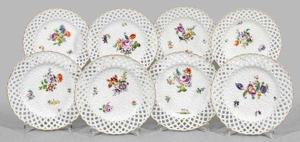 A collection of eight open-worked basketweave porcelain plates with flower decor. Crossed swords mark.