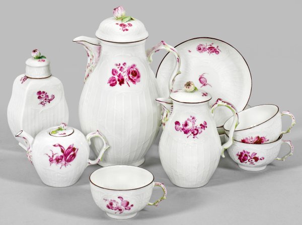 7-tlg.; Kaffeekanne, Tee- und Milchkännchen, Teedose, 3 Tassen mit Untertassen. Form "Reliefzierrat" mit Kartuschen sowie rocaille- und astförmiger Ausguss bzw. Henkel. Plastisch aufgelegte Blütenknäufe. Auf der Wandung und im Spiegel in Kartuschen gerahmte Blumengebinde in purpurfarbener Camaieumalerei. Zweifarbige Staffage in Purpur und Hellgrün. Minim. rest.; Zeptermarke. Kannen-H. 8,5 cm - 23 cm.