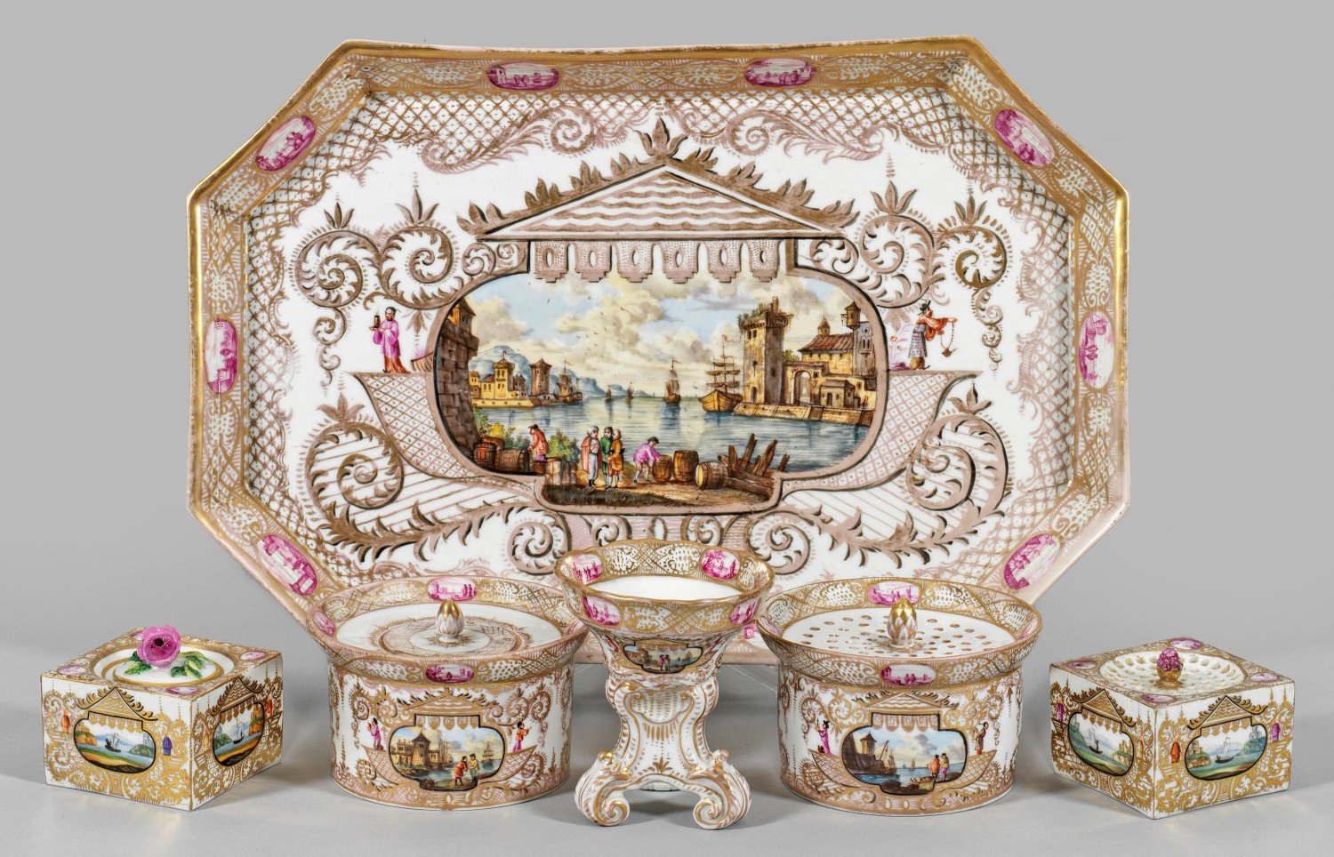 6-tlg.; 2 Tintenfässer, 2 Streusandgefäße, Fußschälchen sowie Tablett. Unterschiedliche Formen, plastische Knäufe. Auf der Wandung und im Spiegel flächendeckender, teilw. schwarz konturierter Golddekor aus Ranken- und Gitterwerk mit Konsolenfiguren und ausgesparten Ovalmedaillons, purpurfarbene Landschaften mit Figurenstaffage darstellend. In ovalen und vierpassigen Reserven Ufer- und Hafenlandschaften mit imposanter Architektur, verhandelnden Kaufleuten zwischen Fässern und Warenballen sowie Hafenarbeiter. Polychrome und purpurfarbene Camaieumalerei. Teilw. rest./ber.; Verschiedene Schwertermarken. Tablett 39 cm x 25 cm. Gefäß-H. 4,5 cm - 9,5 cm.