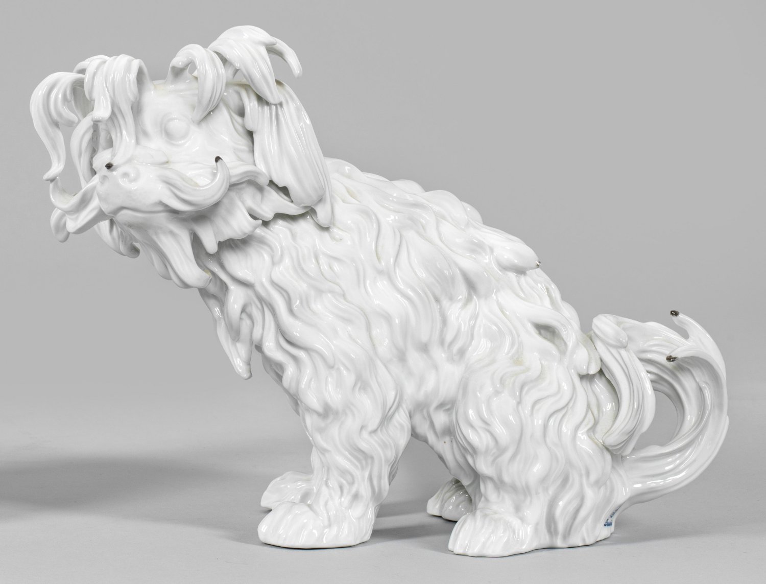 Weißporzellan mit minimaler Farbakzentuierung in Schwarz. Auf seinen Hinterläufen sitzender Bologneser. Stark reliefplastisch gearbeitetes, zotteliges Fell. Nach Meissener Entw. von J. J. Kaendler. Manufakturmarke. H. 39 cm. L. 54 cm.