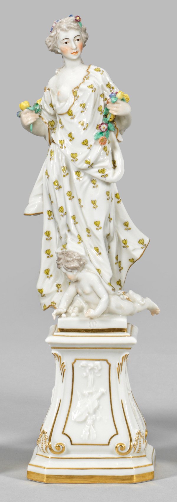 aus der Serie "Jahreszeiten" nach Alt-Frankenthaler Modell. Auf volutenförmig geschweiftem, profiliertem Podestsockel mit Symbolen der Musik stehende Dame in antikisierendem Gewand mit Blumengirlande. Unterhalb liegender Putto. Polychrome Malerei mit Goldkonturierung. Entw. Konrad Link. Manufakturmarke. H. 27,5 cm.