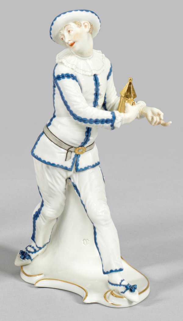 Auf Rocaillesockel mit Stützvolute schreitender, sich zurück gewandter Pierrot im Harlekinskostüm, in der rechten Hand eine Laterne haltend. Polychrome Malerei mit reicher Goldstaffage. Entw. Franz Anton Bustelli, 1759/1760. Modell-Nr. 54. Manufakturmarke. H. 21 cm.