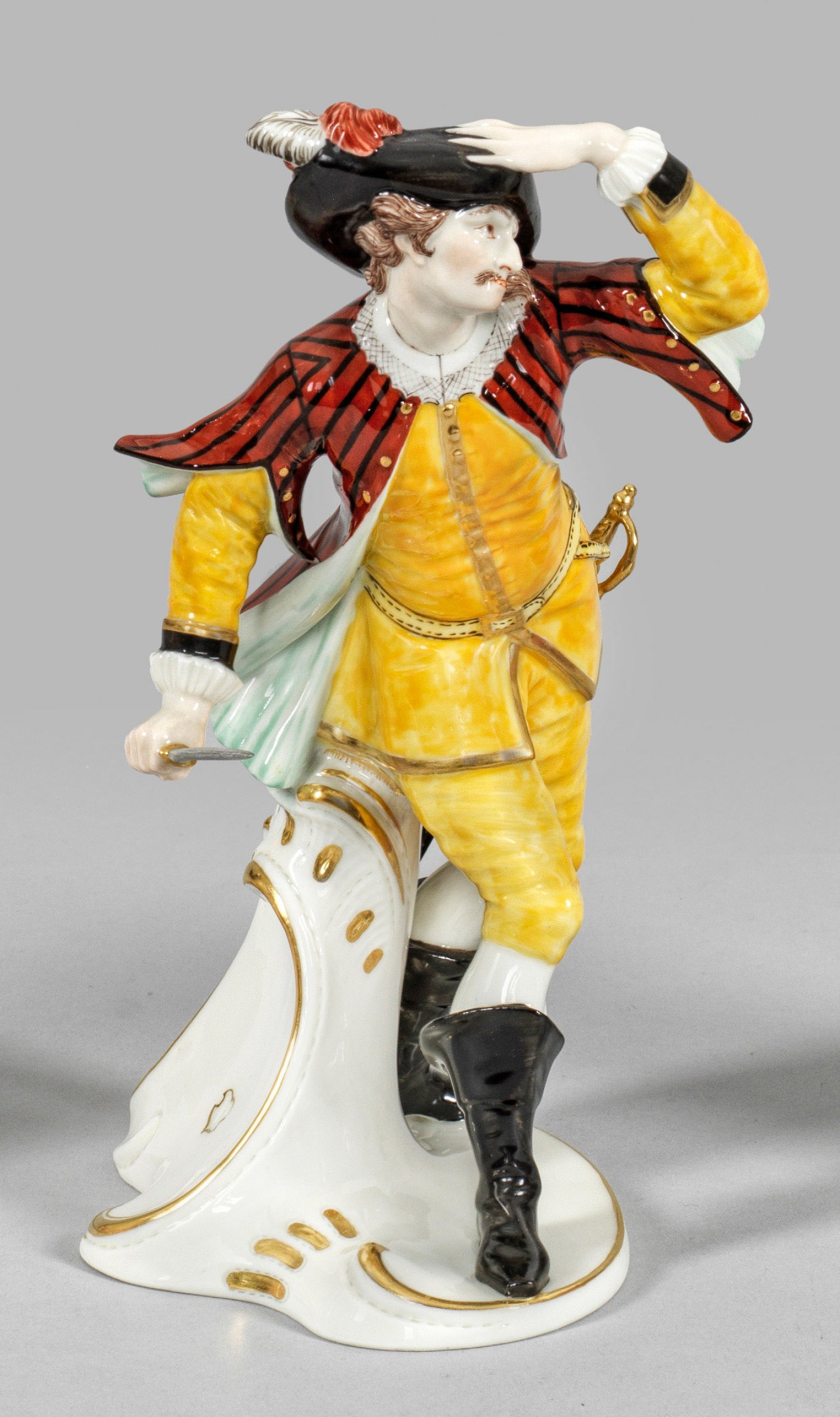 Auf Rocaillesockel mit aufsteigender Volute stehender Komödiant in gelbem Wams und Hose sowie rot-schwarz gestreifter Jacke, mit gezücktem Dolch in der rechten Hand. Mit der Linken an seinen Federhut greifend. Entw. Franz Anton Bustelli, 1759/1760. Polychrome Malerei mit Goldstaffage. Modell-Nr. 272. Manufakturmarke. H. 19 cm.