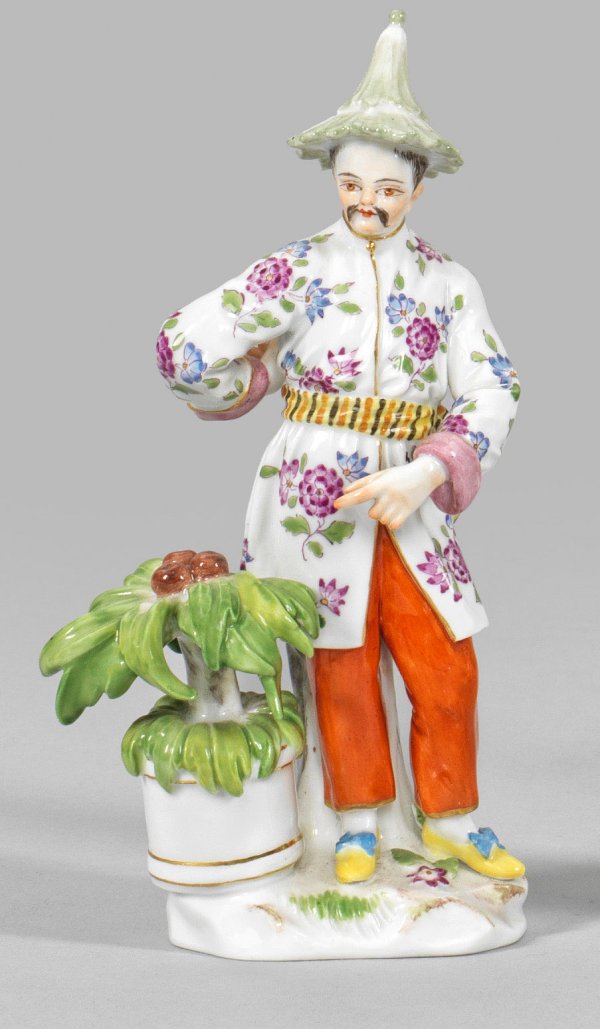Auf naturalistischem Sockel stehender Japaner in geblümtem Kimono und roter Hose mit Spitzhut. Am Boden stehender Blumentopf. Polychrome Malerei mit Gold. Entw. Friedrich Elias Meyer. Modell-Nr. E 40. Schwertermarke. H. 13,5 cm.