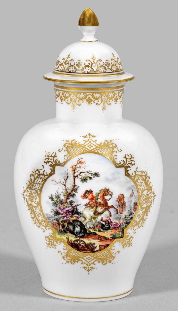 Ovoider Korpus mit gerundeter Schulter und leicht konischem Hals. Übergreifender Haubendeckel mit stilisiertem Pinienknauf. Schauseitige, von feiner, goldornamentierter Vierpassreserve gerahmte szenische Jagddarstellung nach Johann Elias Ridinger, rückseitig farbenprächtiges Blumenbukett in polychromer Malerei. Umlaufend breite Goldspitzenbordüre an Hals und Deckel. Schwertermarke. H. 23 cm.