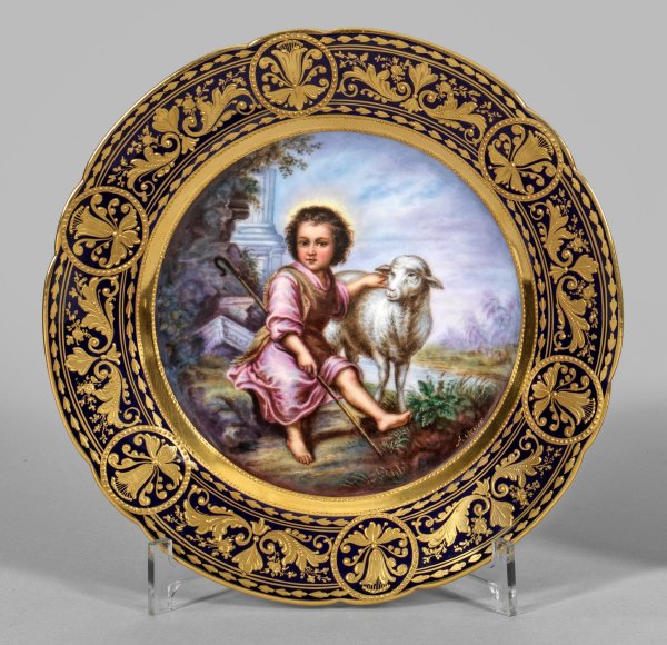 im Alt-Wiener Stil. Runde Form. Im vertieften Spiegel goldgerahmte Darstellung eines Hirtenknaben mit Hirtenstab und Lamm nach einem Gemälde von Bartolomé Esteban Murillo. Auf der Fahne reicher Reliefgolddekor aus Rankenornamentik und Medaillons im Rapport auf kobaltblauem Fond. Sign. "A. Geyer". Im Boden bet.; Malermarke. Manufakturmarke. D. 24 cm.