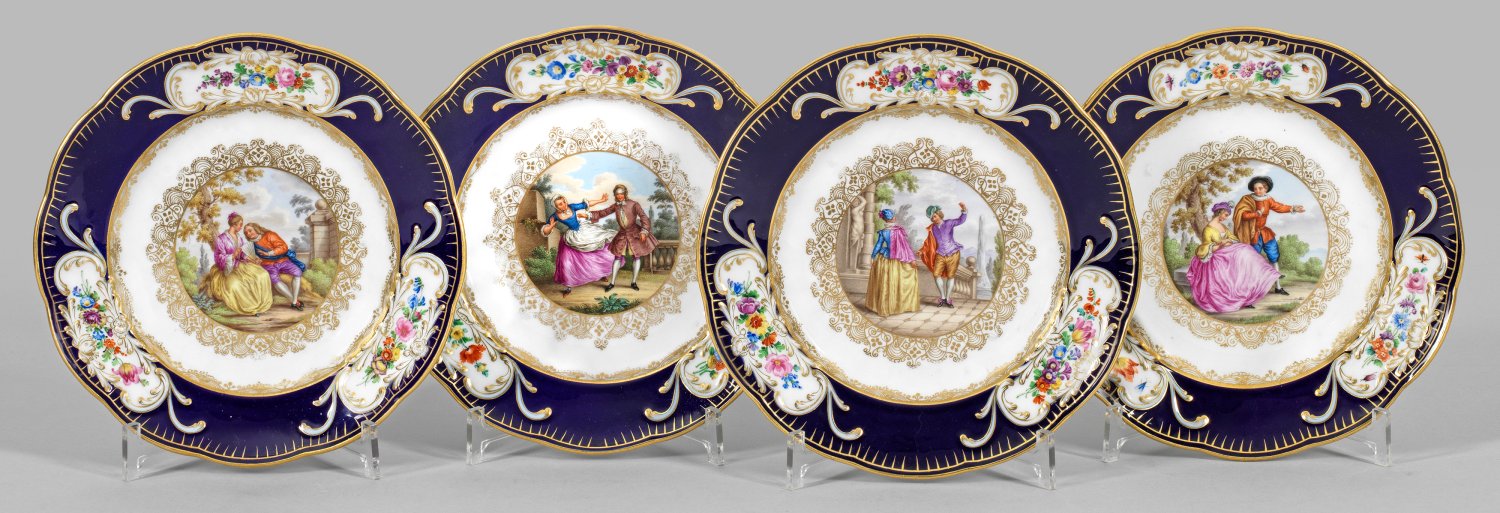 Runde, passig geschweifte Form. Im leicht vertieften Spiegel in breiter Goldspitzenrahmung unterschiedliche szenische Darstellungen elegant gekleideter Paare vor Landschafts- bzw. Architekturkulisse, u. a. bei der Konversation und beim "Blinde-Kuh-Spiel". Auf der kobaltblauen Fahne ausgesparte, florale Reliefkartuschen mit farbenprächtigen Blumenarrangements. Polychrome Malerei mit Golddekor. Teilw. Haarriss. Schwertermarke. D. 24 cm.