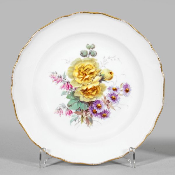 A porcelain plate painted with flower bouquets in the manner of J. E. Braunsdorf. Minor rubbed. Crossed swords mark.