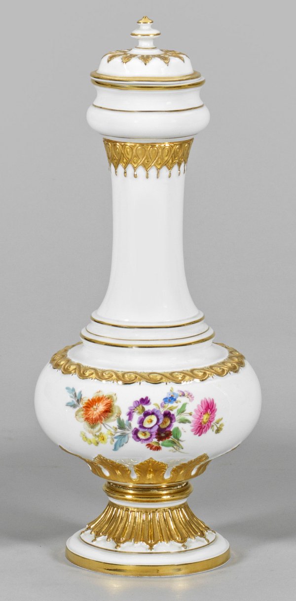 Balusterförmiger Korpus mit schlankem Hals und gewölbtem Deckel, umzogen von unterschiedlichen, reliefierten, vergoldeten Ornamentbordüren. Beidseitig der Wandung farbenprächtiges Blumenarrangement in polychromer Malerei. Schwertermarke. H. 32,5 cm.