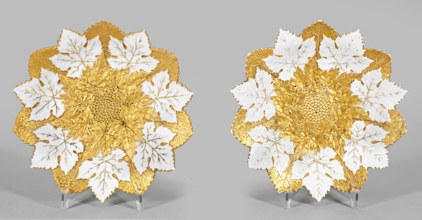 A pair of splendid porcelain plates with vine leaf relief and gold decor. Crossed swords mark.
