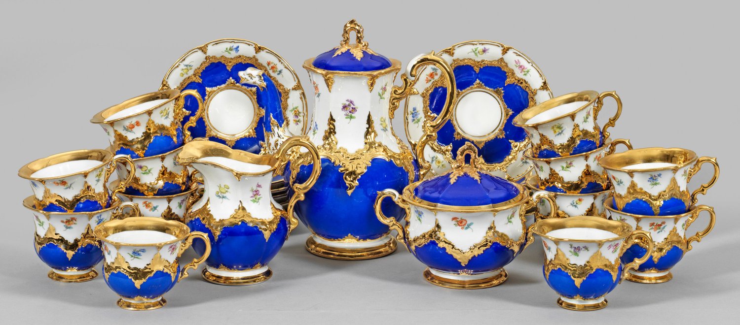 15-tlg.; Kaffeekanne, Milchkanne, Zuckerdose, 12 Kaffeetassen mit Untertassen. Königsblauer Fond mit Rocaillen in Glanzgold sowie mit Dekor "Streublume" in weißem Fond. Sog. "B-Form". Ber./Rest.; Schwertermarke. Kannen-H. 24 cm.